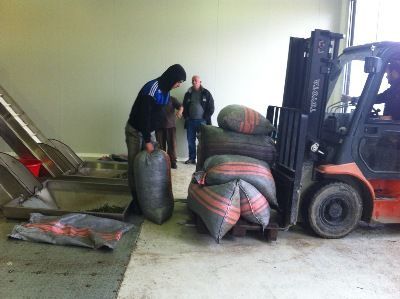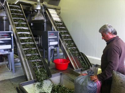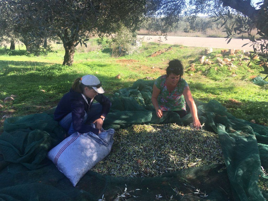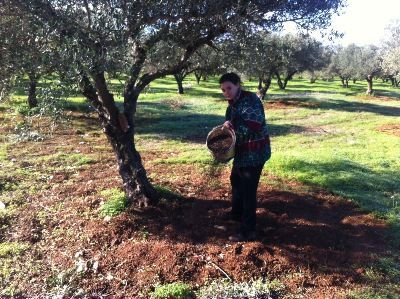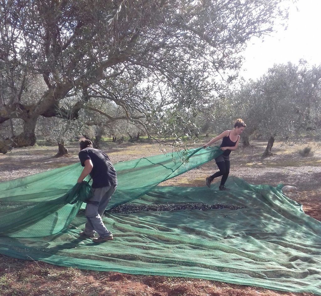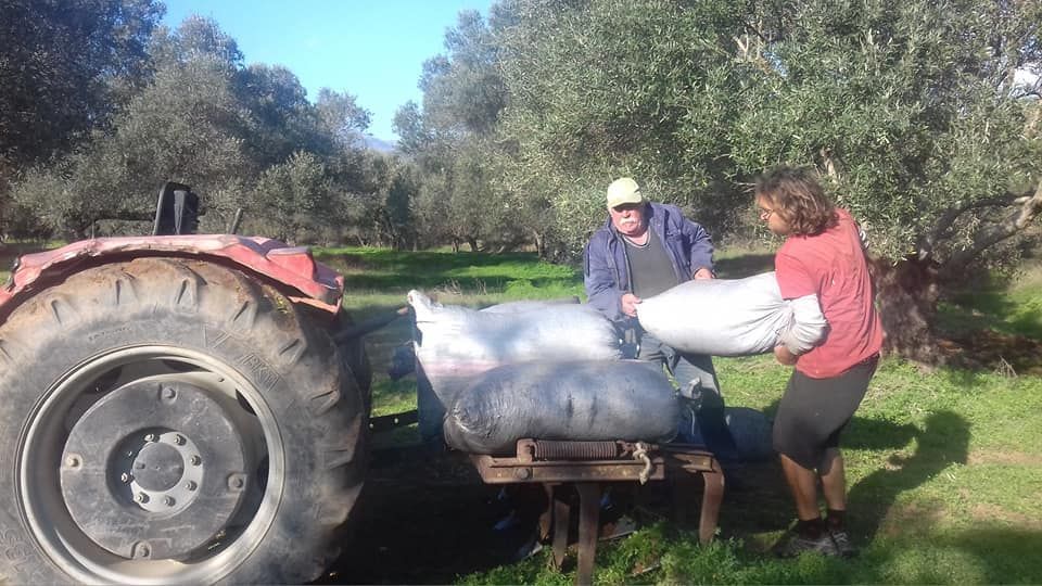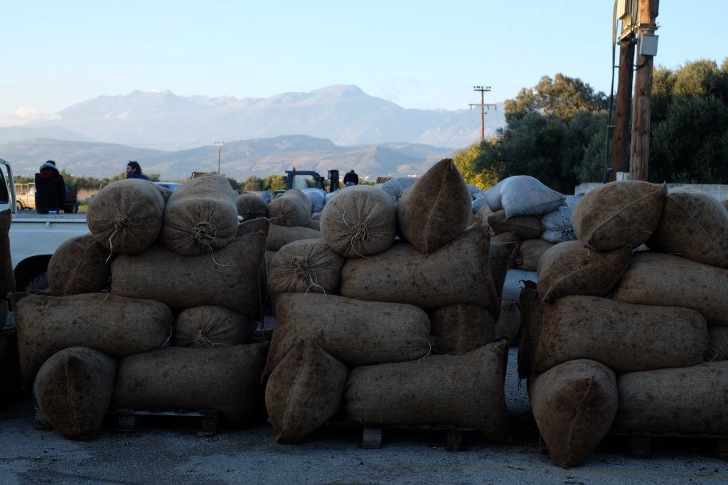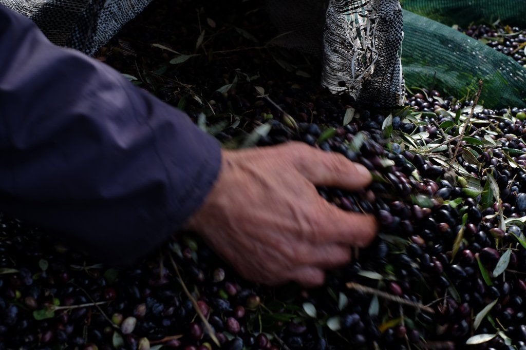 Nimble hands sort out roughly the leaves and twigs. The olives are put into sacks.