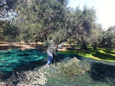 The branches are shaken with a harvesting device so that the olives fall onto the nets.