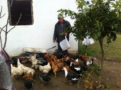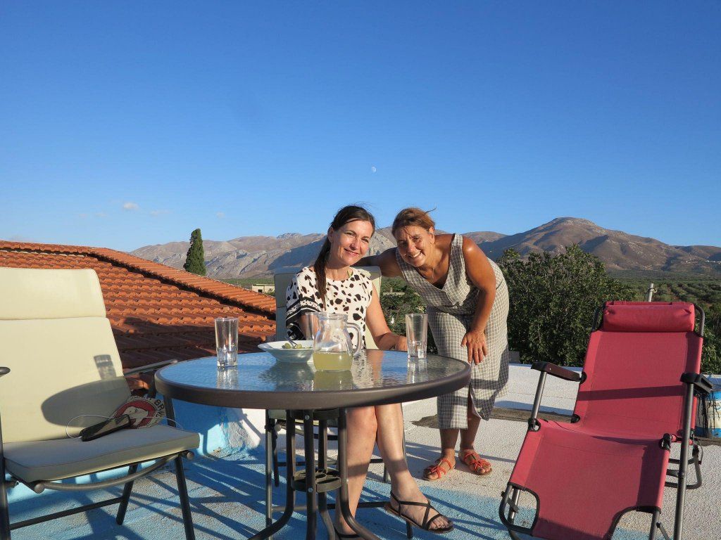 Our dear guests from France chat with the widows of Vagionia on the bench in front of our house, the meeting place of the women of the village.