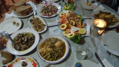 You can book a complete holiday package. In the package included is one week rent of the studio, full board (the typical Cretan food is cooked by Dimitris, who spoiles his guests since more than 40 years), pick up and bring service from and to the airport Heraklion and daily excursions to the place of your choice in our region. The package costs 840 Euros for one person and one week. For each additional person the package costs 210 Euros per week.